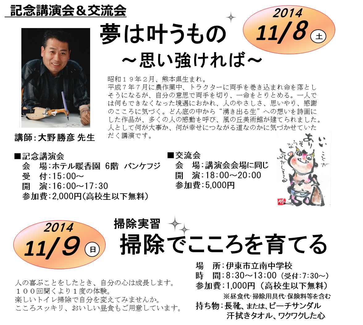 16:00 ~ 17:30 大野 勝彦 先生 演題「夢は叶うもの」~思い強ければ~ ホテル暖香園 6階 バンケフジ ¥2.000 (高校生以下無料) 18:00 ~ 20:00 ホテル暖香園 6階 バンケフジ(講演会場と同じ) ¥5.000 |
